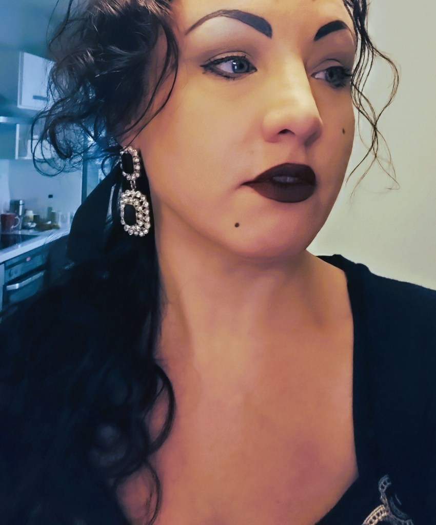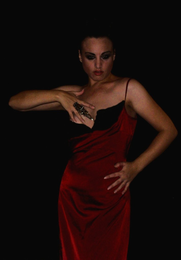 Elden tänds bakom henne.